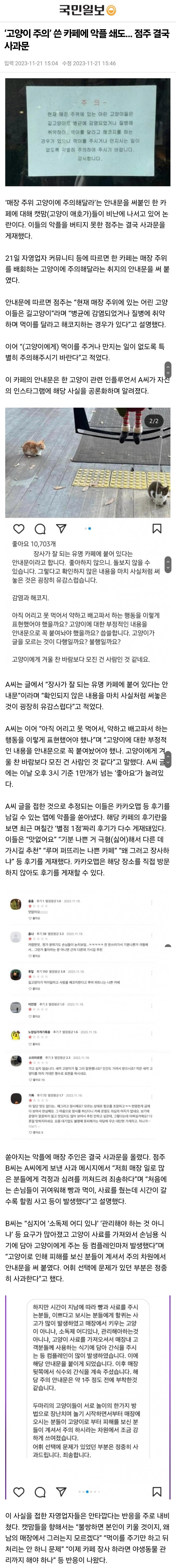 저 카페는 고양이 때문에 피해를 입어서 손님들에게 주의하라고 안내문을 쓴건데, 그거 가지고 난리라니...