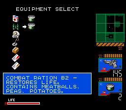 솔리드 스네이크가 가지고 있는 음식물이라곤 레이션밖에 없다.