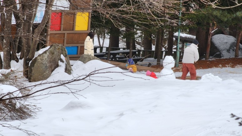 넓은 잔디광장은 어느 정도 경사가 있어 눈이 내리면 자연 눈썰매장으로 변한다.