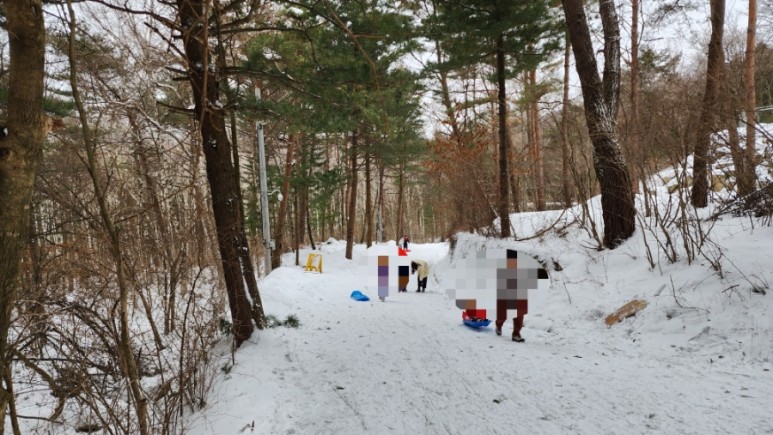 휴양림 입구에서 직원이 눈썰매를 타지 말라고 안내를 할 정도다.