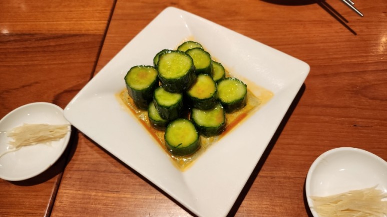 참기름과 고추기름을 발랐는지, 고소하면서도 약간 매운맛 비스무리하게 느껴지면서 간장 맛도 살짝 나고, 새콤한 식초 향도 나는 그런 오이 되겠다.