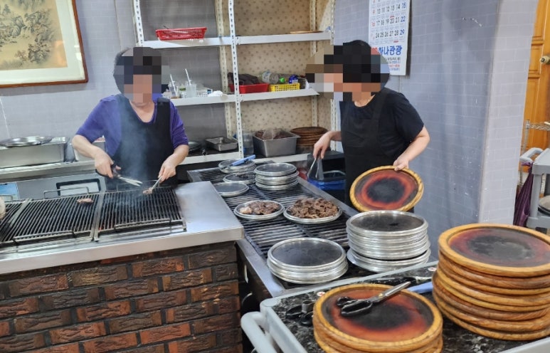 카운터 바로 뒤쪽에는 갈비를 굽는 대형 숯불 그릴이 있다.