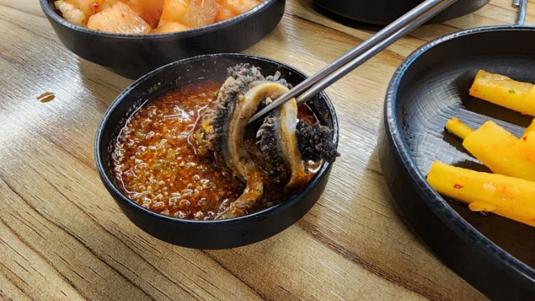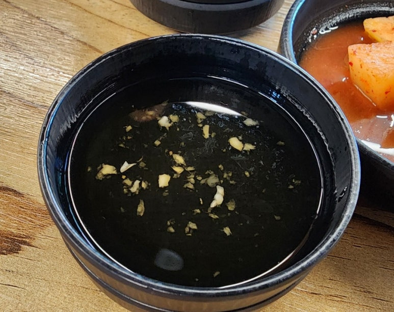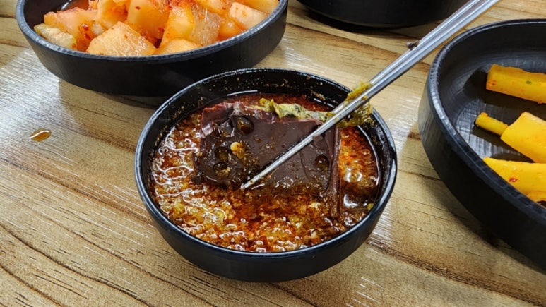 그릇에 가득한 내장들을 소스에 찍어 먹다 보면 어느새 국물만 남게 되는 수가 있다.