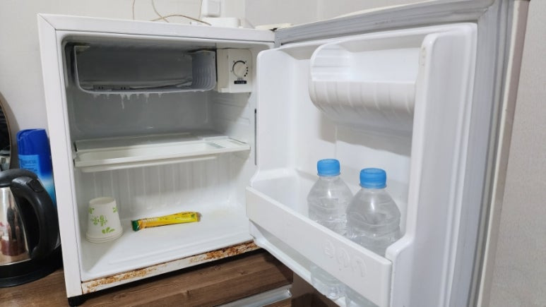 냉장고 안엔 물과 커피가 있는데, 물은 카운터 앞에 정수기를 이용해도 된다.