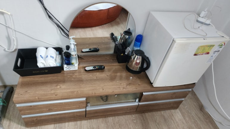 그리고 그 옆에 작은 냉장고가 서랍장 위에 올라가있다.