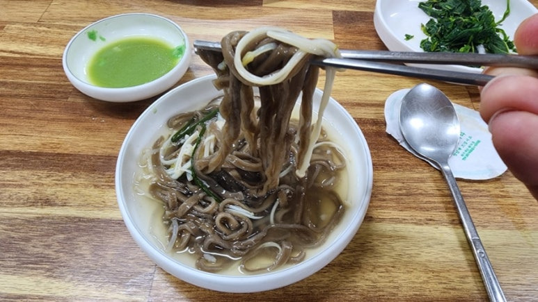 면 색이 거무튀튀한게 메밀이나 칡즙이라든지, 뭐 다른게 들어간 면 같다.