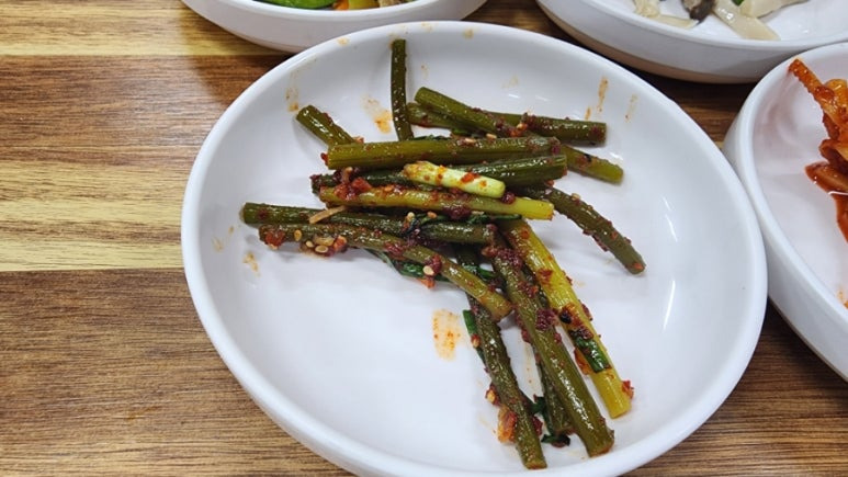 다른 반찬도 맛있는데, 마늘쫑 무침은 단연 독보적이었다.