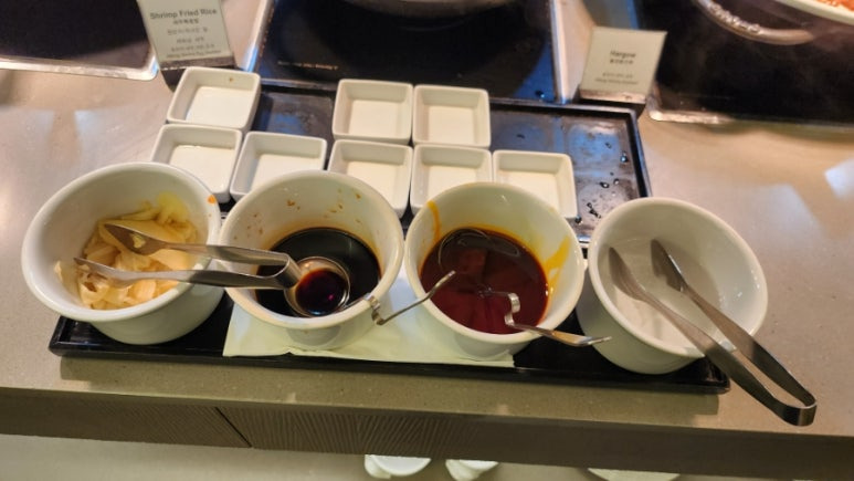 연어회 옆에 초장 및 간장, 와사비, 생강 절임 등이 있어서 이곳을 이용해 소스를 만들면 되는데...