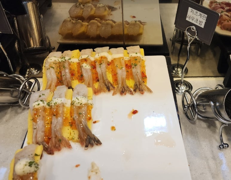다른 쿠우쿠우에는 새우 초밥이 있다.