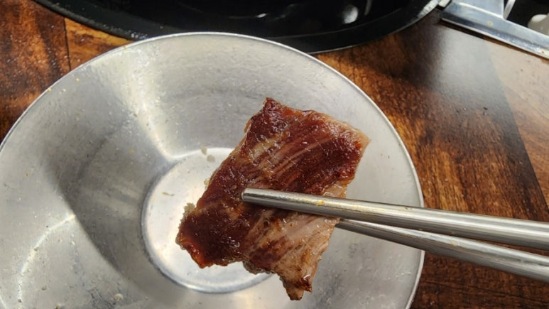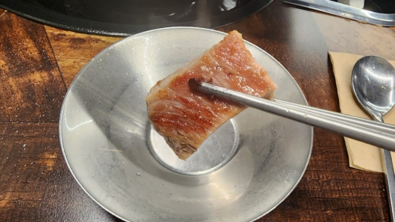 먹을 만큼 덜어온 후 고기를 뒤집어본다.