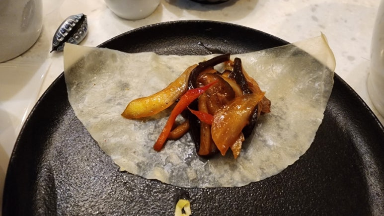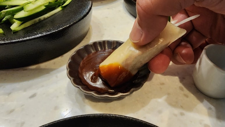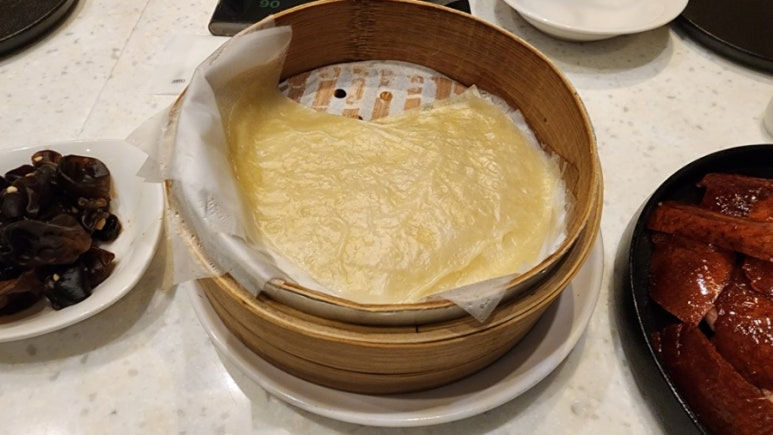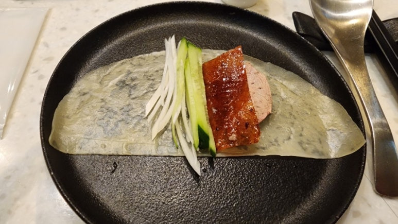 오리 껍질과 살코기, 그리고 채소들이 찹쌀전병(?)과 함께 입안에서 소용돌이친다.