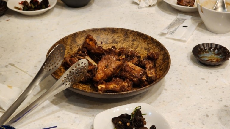 뼈 튀김은 양 꼬치를 찍어 먹는 쯔란이 적절히 뿌려져있어서 내가 오리를 먹는 건지 양 꼬치를 먹는 건지...