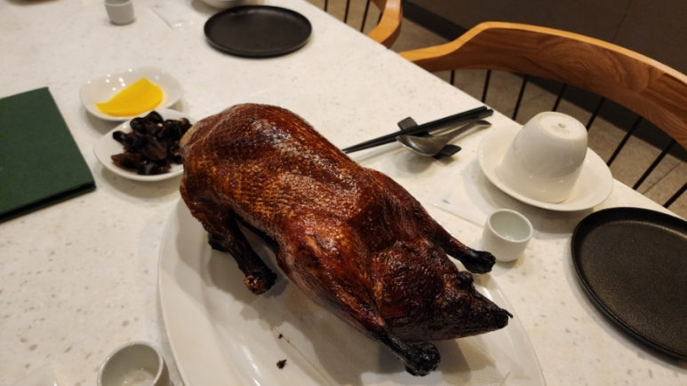 미리 주문을 해놨기에 먹기 좋게 자르기 전 통 오리를 볼 수 있었다.