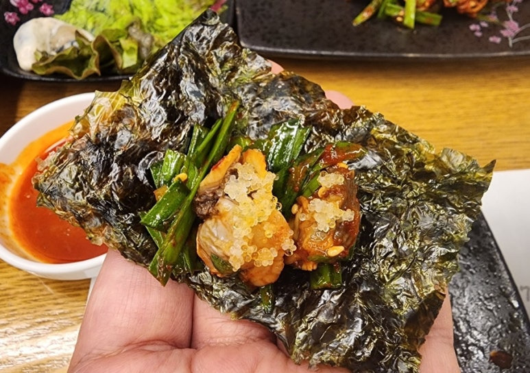 김에 꼬막무침을 싸서 날치알을 얹어 먹으라는 사장님의 조언을 듣고...
