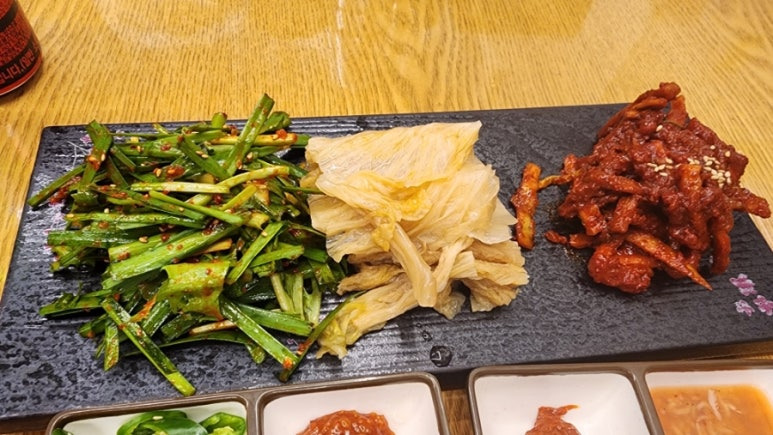 부추무침, 씻은 묵은지, 무 무침.
