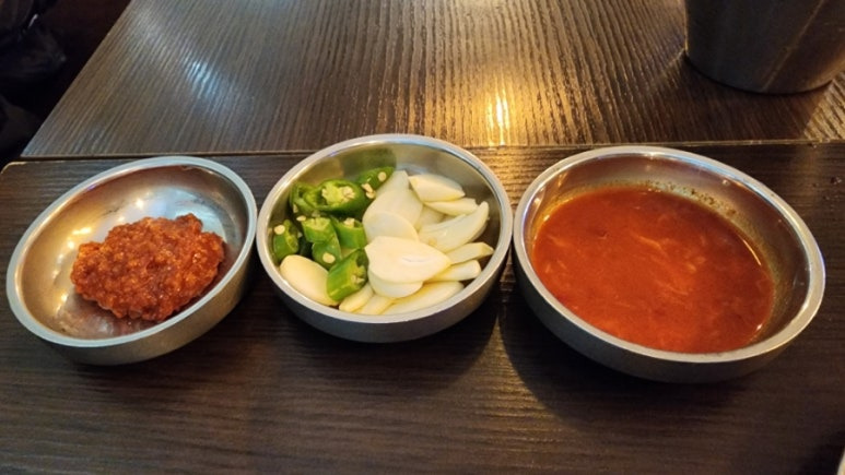 돔베 고기가 나오기 전에 함께 먹을 곁들임 반찬들이 나왔다.