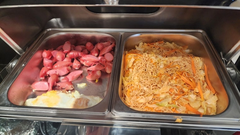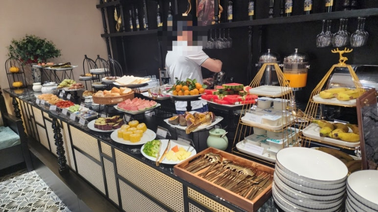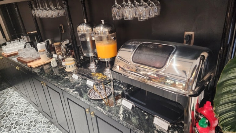 호텔 투숙객이면 이용할 수 있는 조식 뷔페는 단출하지만 깔끔하게 구성되어 있다.