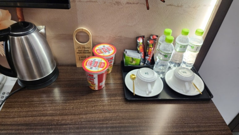 일단 TV장 위엔 물과 차, 커피, 커피포트, 컵라면이 있다.