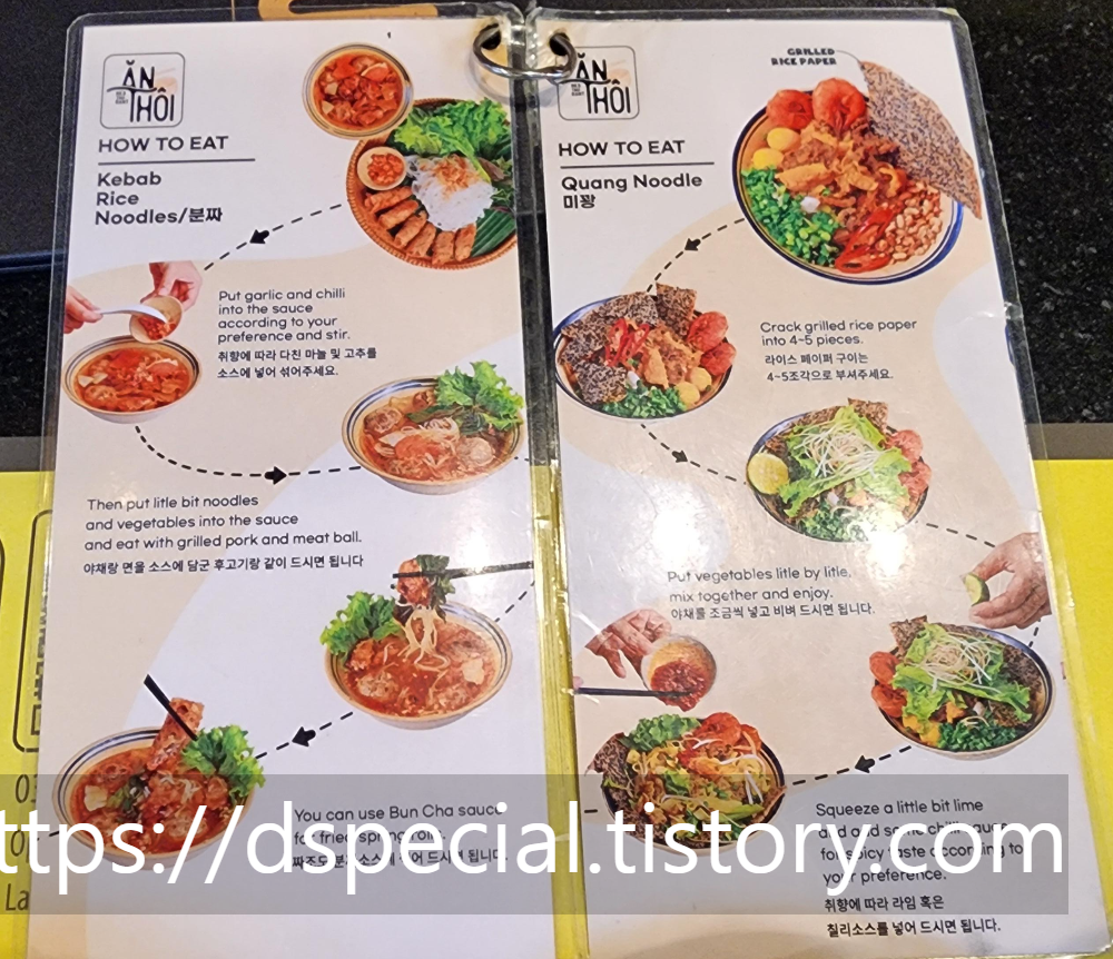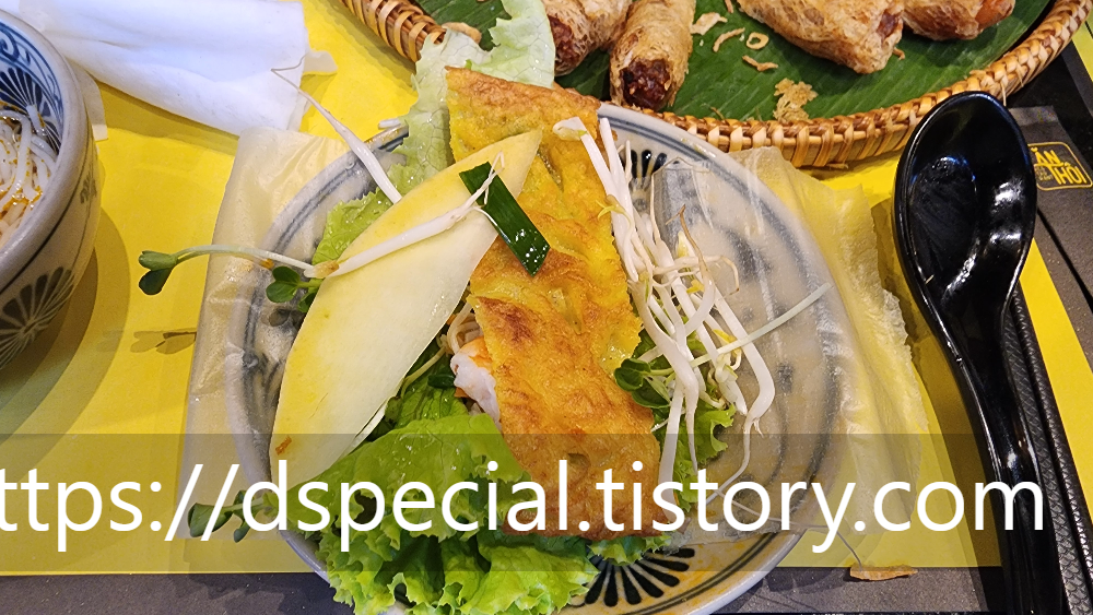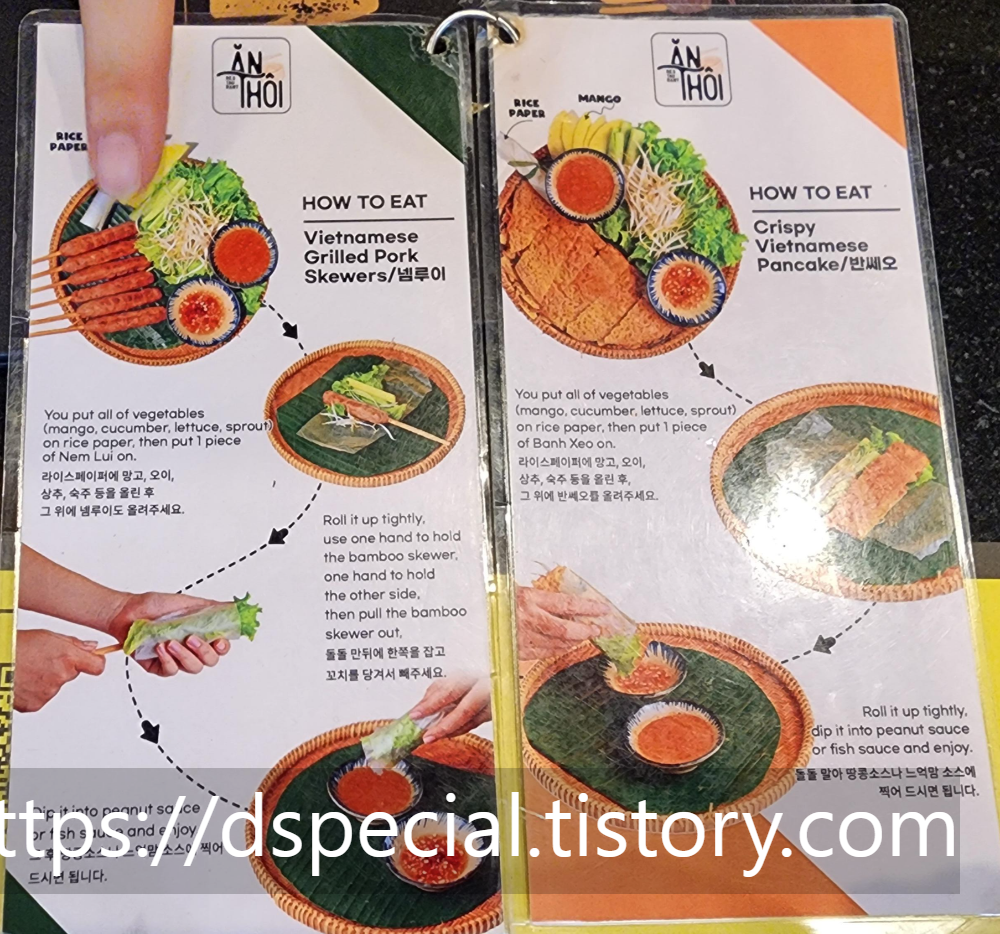 반쎄오는 라이스페이퍼에 올려두고 각종 채소를 넣은 뒤 돌돌 말아서 소스에 콕! 찍어 먹으라고 쓰여있다.