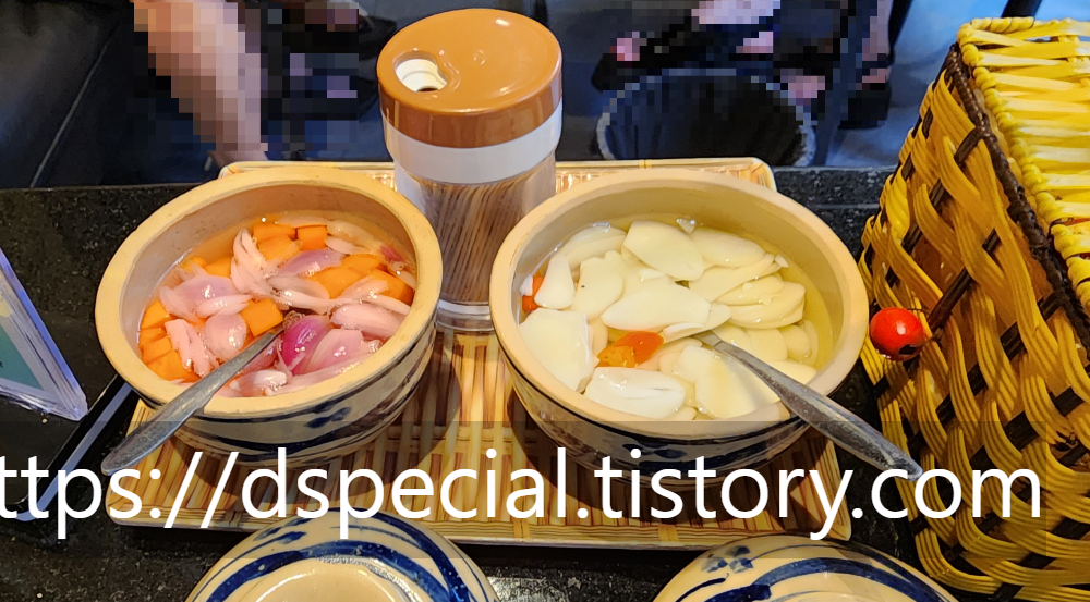 식탁 한쪽에 소스가 있는데, 당근과 샬럿 등이 들어간 느억맘 소스와 식초에 절인 마늘 소스가 있다.
