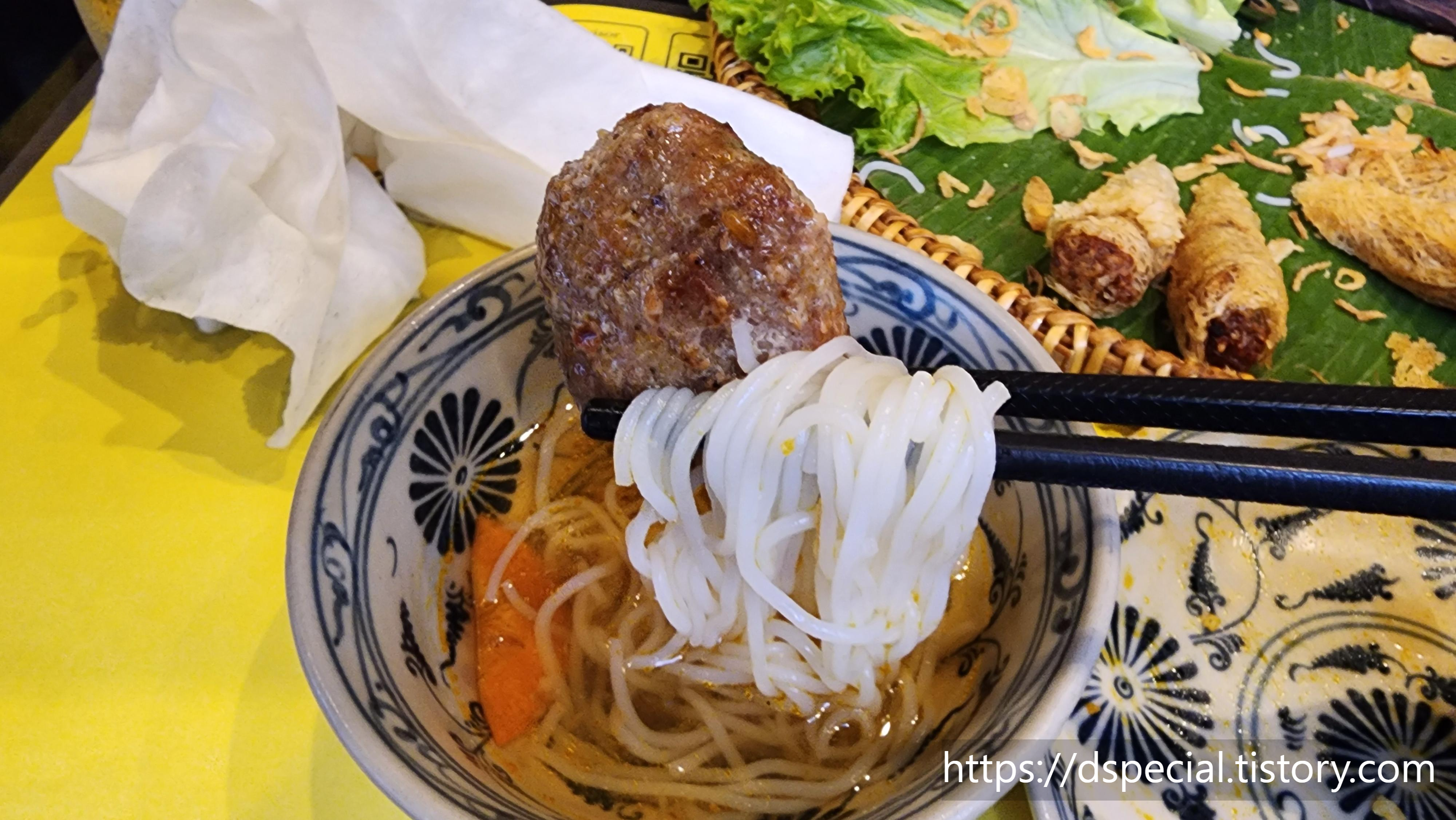 쌀국수와 튀김 롤('짜조'라고 하던가?)이 담겨있는 접시와 소스에 고기 경단이 들어가 있는 접시가 나온다.