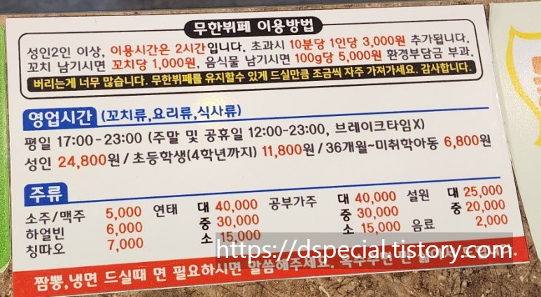 2시간 안에 마음껏 먹을 수 있고, 음식을 남기지 말아 달라는 내용이다.