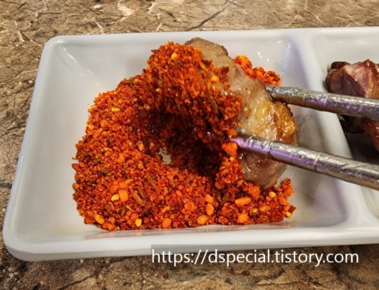 잘 익은 양꼬치를 꼬치에서 빼낸 후 공식 양념인 쯔란에 푹! 찍어 먹어본다.