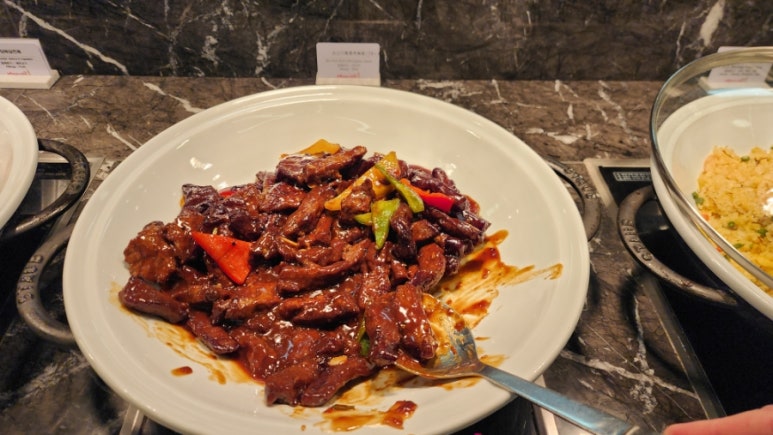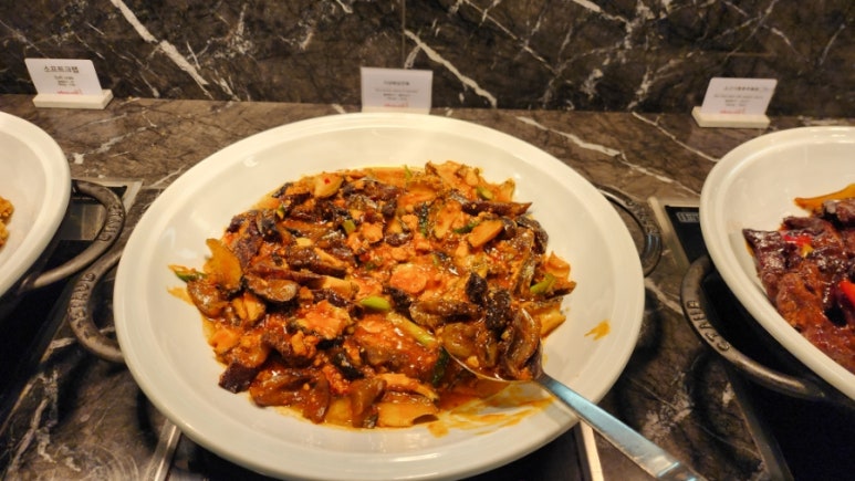 소고기 후추 볶음, 해삼과 전복, 소프트 크랩 등 고급스러워 보이는 중국 음식들이 있다.
