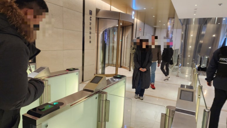 출입 게이트에 카드를 찍고 안으로 들어가면 엘리베이터를 탈 수 있다.