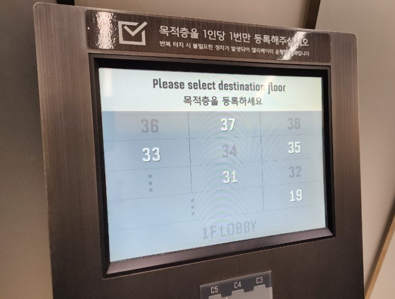 엘리베이터를 타려면 터치스크린으로 가고자 하는 층을 누르면 된다.