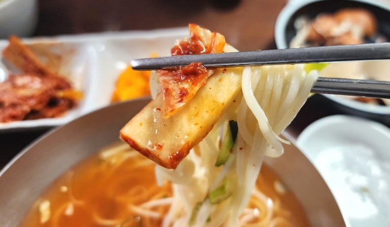 아삭하면서 시큼한 맛이 구수한 국수의 맛과 합쳐지면...