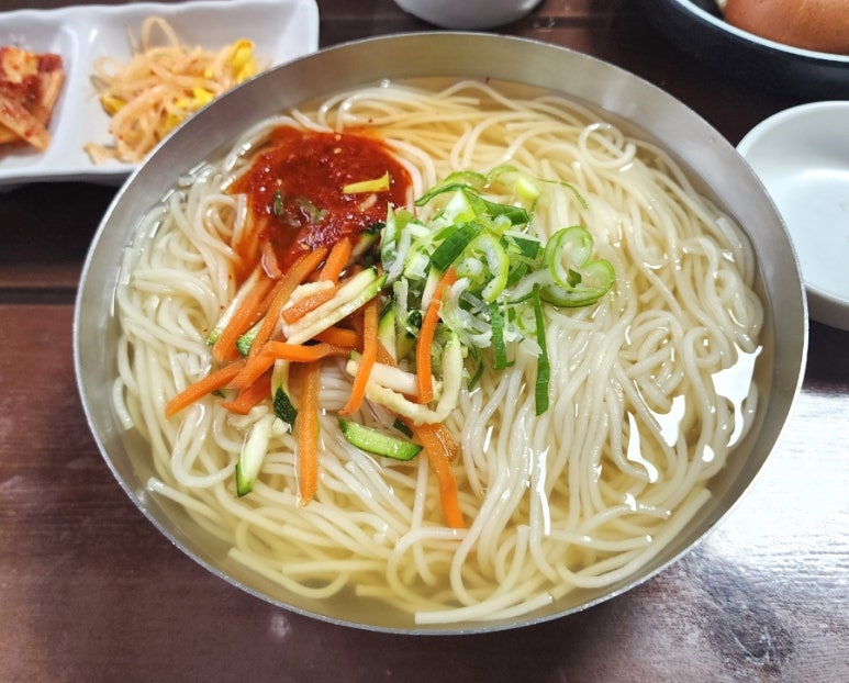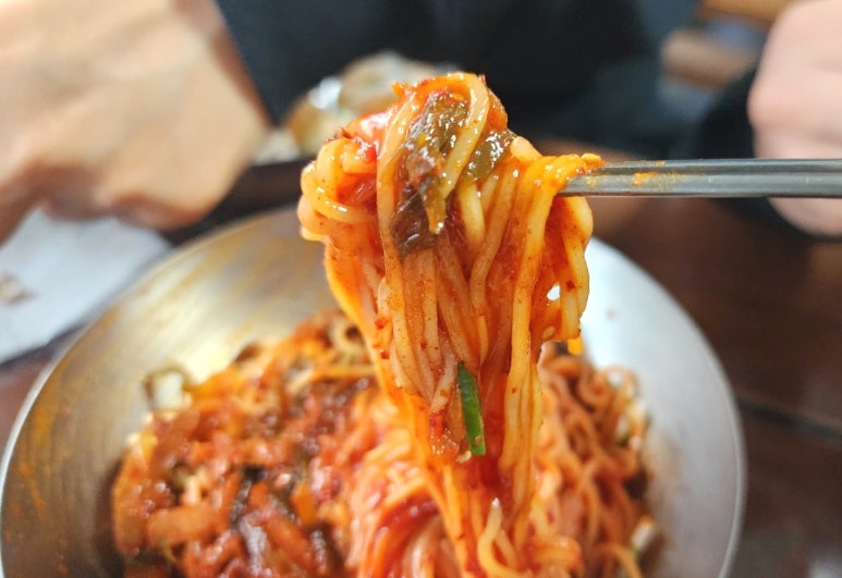 중면으로 만든 국수라 입안 한가득 씹히는 맛이 좋다.