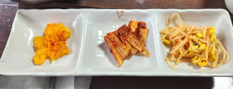 국수와 곁들여 먹을 반찬은 단무지, 김치, 콩나물무침이 나온다.