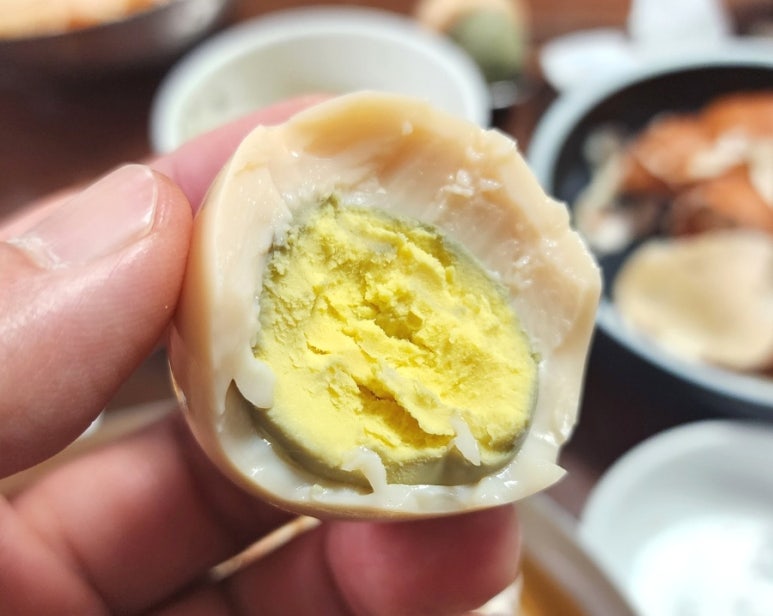 삶은 계란 같은데 색이 약간 거무튀튀하다.