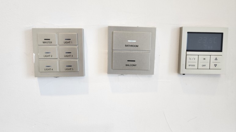 방 벽에는 컨트롤 패널이 있어서 조명과 에어컨 등을 한 번에 조작할 수 있다.