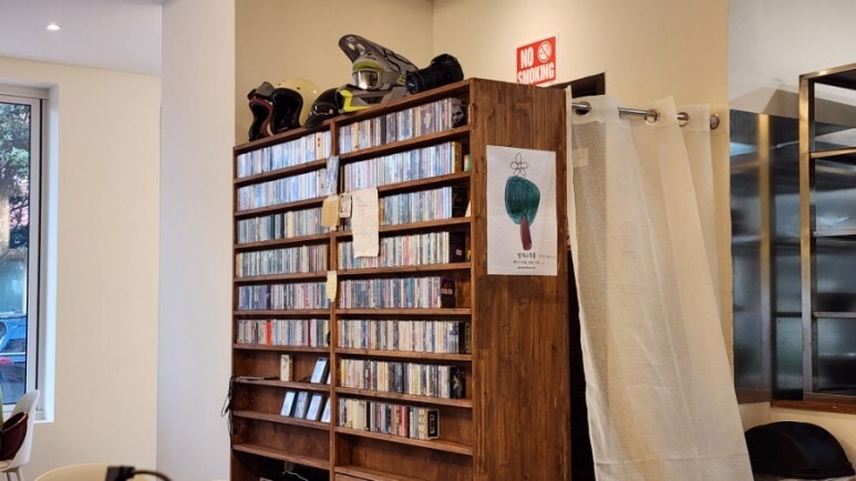 폭풍 주문을 하고 주변을 보니 카세트테이프들이 잔뜩 꼽혀있는 책장(?)이 보인다.
