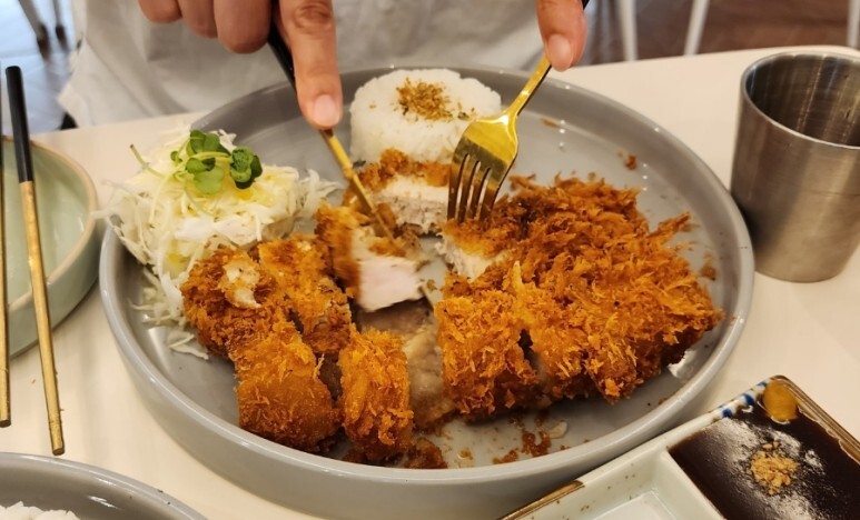돈까스 튀김옷을 입은 겉은 바삭, 안쪽에 비계와 고기는 촉촉!