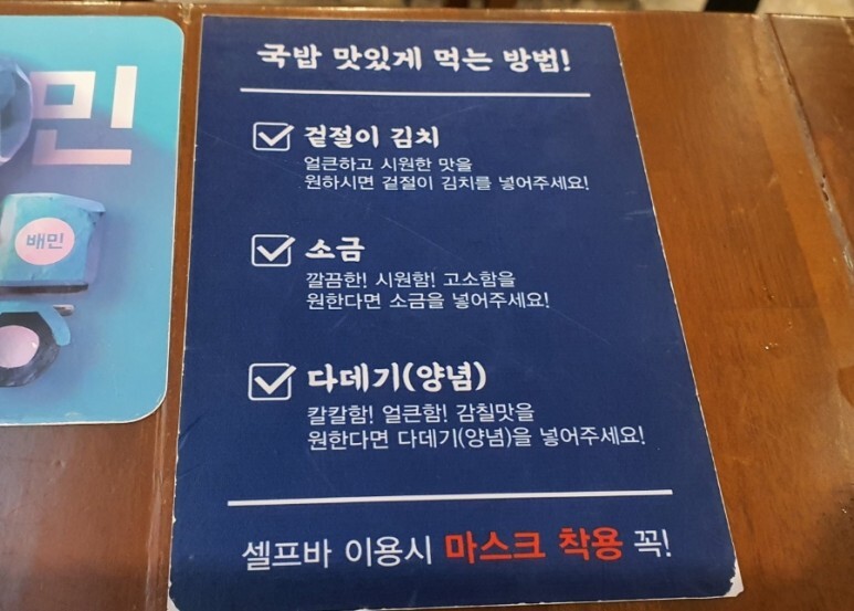 여기 국밥은 간이 하나도 안 되어있어, 먹는사람이 입맛에 맞게 간을 해야한다.