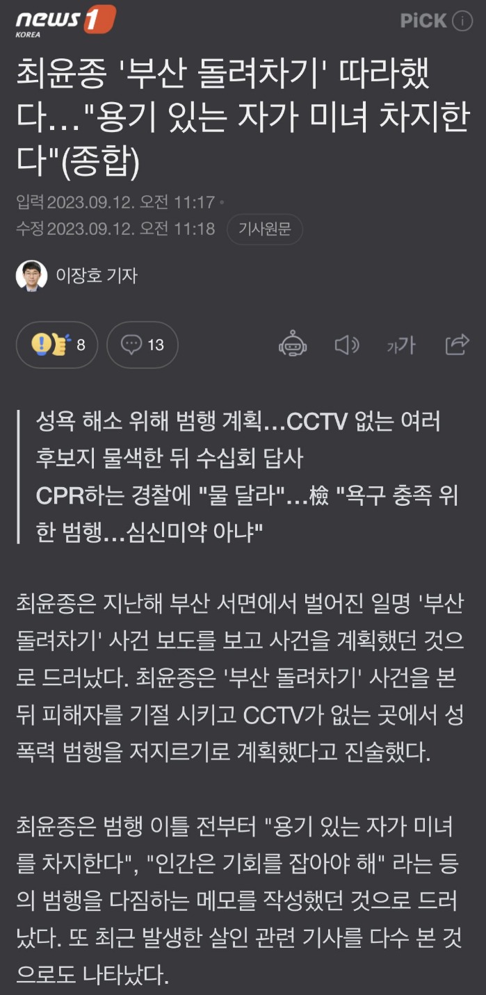 | 건물 옥상에서 지나가는 행인 향해 3kg 벽돌 투척 (0) | 2023.09.13 |