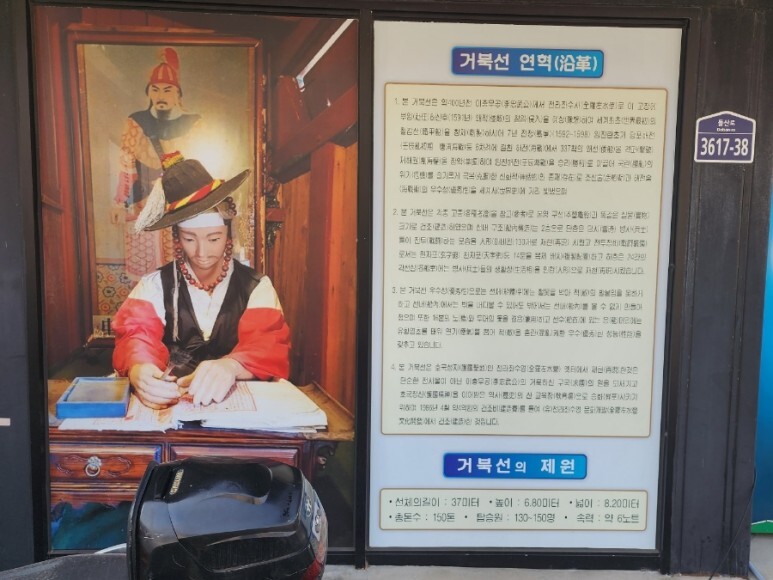 뒤편에서는 대형 TV에서 거북선에 대한 다큐멘터리가 방송되고 있다.