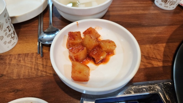 김치, 깍두기, 새우젓 등 반찬들을 셀프로 가져다 먹을 수 있다.