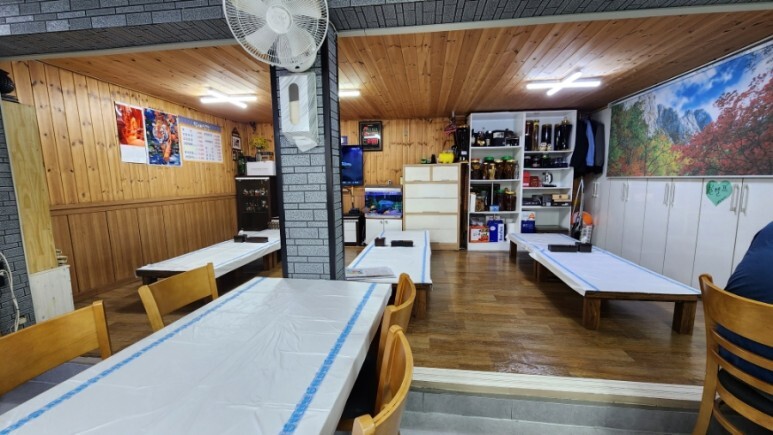 안에는 식탁 6개와 좌식 상이 있다.